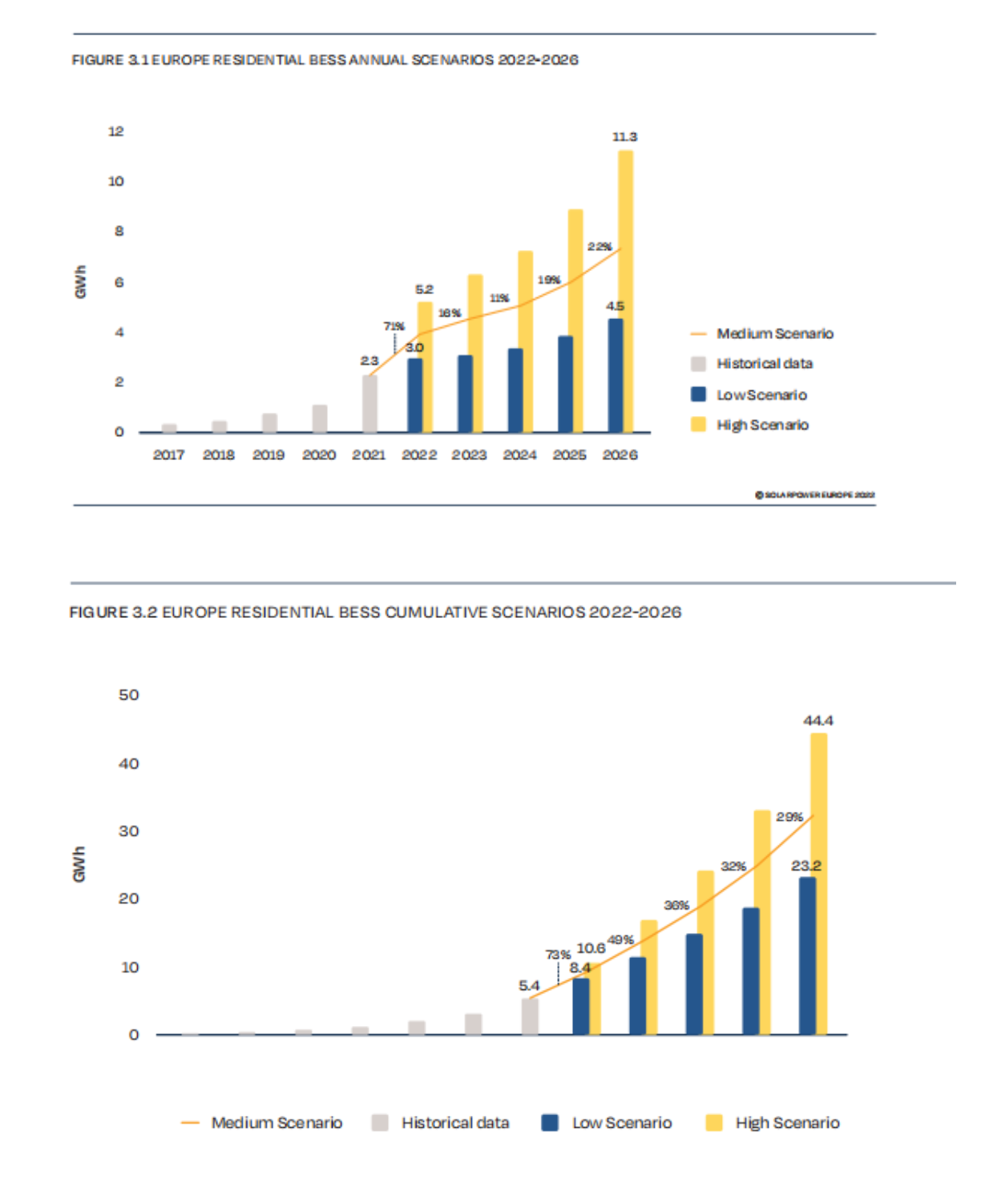 根據(jù)歐洲光伏產(chǎn)業(yè)協(xié)會的預測,在中期情景下,2023年,歐洲家庭戶儲新增部署將達4.5GWh,2024年為5.1GWh,2025年為6.0GWh;2026年為7.3GWh。
