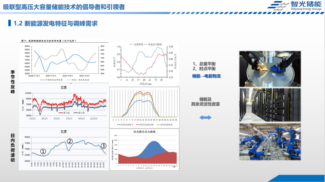 這個圖是網(wǎng)絡(luò)上的圖,也是公知的。我們可以看到左上角這個圖是我們國家在2020年的冬季到2021年的秋季全社會的新能源電量和總負(fù)荷的對比關(guān)系,這個圖很清晰的表明了整個新能源發(fā)電跟負(fù)荷總需求呈現(xiàn)典型的時間上的錯位,我們可以看到區(qū)域性的江蘇電網(wǎng)的電量需求曲線,把這個圖稍微壓縮一點(diǎn)就跟上面全國電量是很相近的形式。右上角是以風(fēng)電為例,它和負(fù)荷需求形成日內(nèi)的嚴(yán)重時間錯位。所以我們不應(yīng)該去批判負(fù)荷特性是什么,也不應(yīng)該去批判新能源的特性是什么,問題是產(chǎn)生了時點(diǎn)上的錯配,我們該如何解決這個問題,所以這是我們所要關(guān)注的。