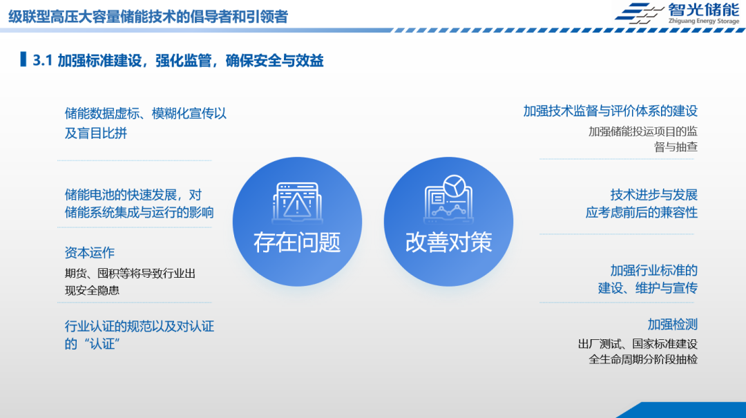 產(chǎn)業(yè)技術(shù)是我在專家會上提的幾個問題。近5年我們發(fā)現(xiàn)儲能行業(yè)整個行業(yè)在技術(shù)的研究上應(yīng)該是全產(chǎn)業(yè)鏈做了很多的創(chuàng)新,涵蓋從電芯到集成、到政策,到人才機(jī)制,到全生命周期的管理。所有的創(chuàng)新圍繞幾個方面,一個是儲能系統(tǒng)的安全性,二是儲能系統(tǒng)的經(jīng)濟(jì)性,三是全生命周期的管理。我們知道這些年由于大數(shù)據(jù)平臺化管理對于我們一個儲能電站數(shù)十萬,幾百萬電芯的使用起到保駕護(hù)航的作用,所以這里面也是基于這個觀點(diǎn)我個人是不太贊成特大規(guī)模電化學(xué)儲能電站的建設(shè),另外就是這些年的技術(shù)發(fā)展我們可以看到儲能造價從2018年2.1塊左右到現(xiàn)在是1.15塊了,效率從80%左右到90%了,直掛從6kV伏到35kV的電壓,容量已經(jīng)到了單機(jī)25MW,這是在行業(yè)里進(jìn)行創(chuàng)新所帶來的效果。