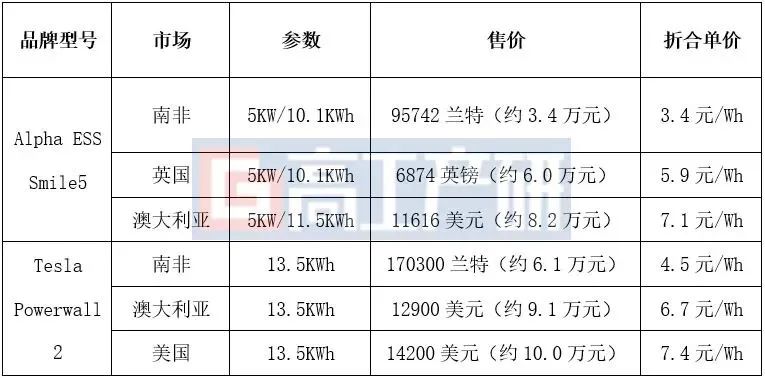 典型戶儲(chǔ)產(chǎn)品不同市場終端售價(jià)對(duì)比