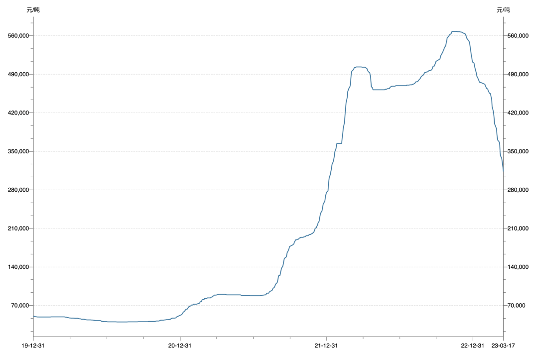 中國儲能網(wǎng)訊:從去年底開始,碳酸鋰作為汽車動力電池的重要原材料之一,價格一直動蕩和變化。到今年3月中,電池級碳酸鋰均價從最高峰的57萬每噸,降到33.3萬元/噸;與去年底相比,2023年鋰價已累計下跌超35%;與之同時,其他原材料,比如用于六系以上的三元鋰電池的氫氧化鋰,均價也大幅下跌。