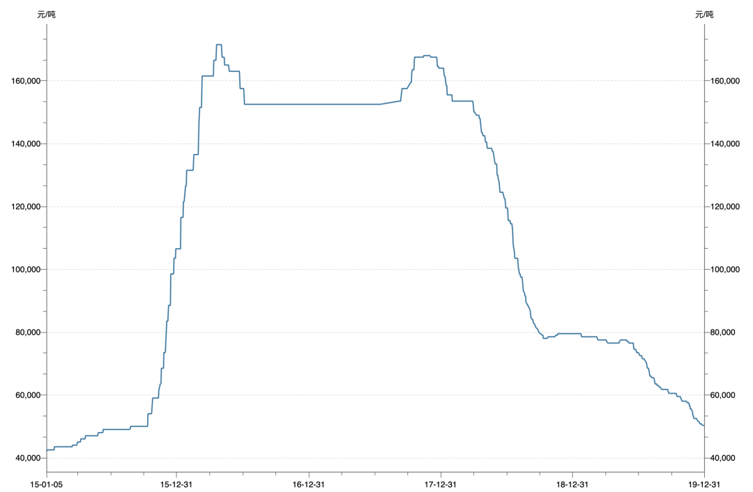 這波漲幅在2019年底停止了,新能源汽車補貼開始取消——國家補貼減半,地方補貼完全取消,動力電池需求同時減弱,價格開始快速下墜,一年的時間基本回到最初的位置。