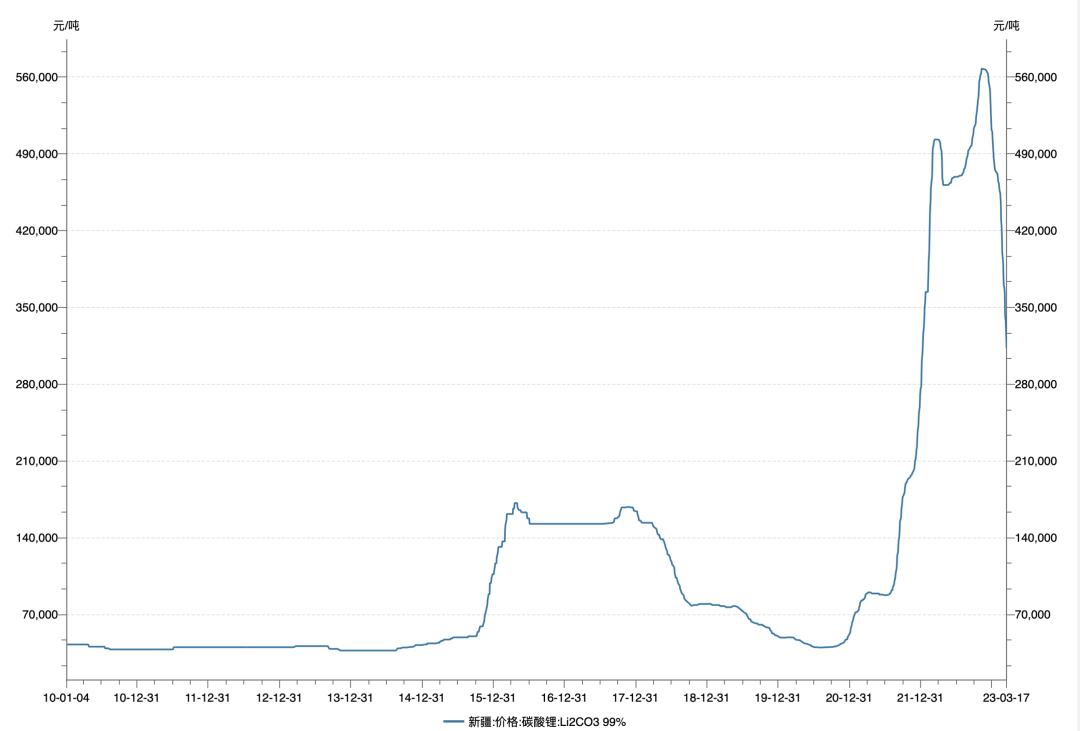 但是這些政策不如需求下降來得管用,2023年2月,隨著動力電池的需求下降,碳酸鋰的價格自然一路下跌,囤積的碳酸鋰開始大量拋貨。