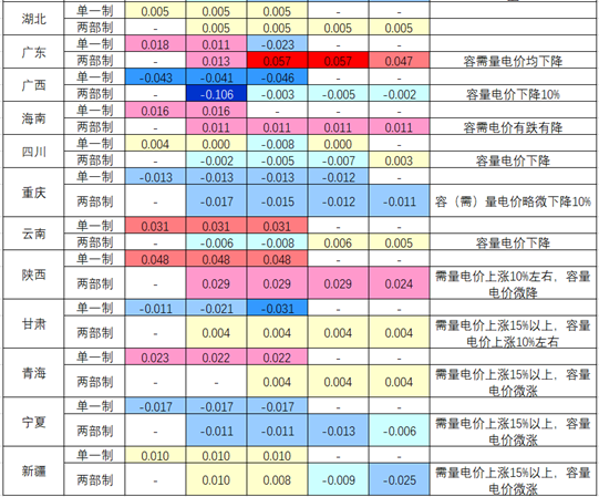 由于新版輸配電價不再包含上網(wǎng)環(huán)節(jié)線損費用和抽水蓄能容量電費等影響,要與上一版輸配電價進行對比,需要將電度輸配電價、容(需)量電價、上網(wǎng)環(huán)節(jié)線損費用折價、系統(tǒng)運行費用折價作為整體進行對比,在此不妨稱為“綜合輸配成本”。同時由于上網(wǎng)環(huán)節(jié)線損、系統(tǒng)運行費用隨每個月購電價格、容量提供主體運行變化等因素而略有變化,嚴格意義上下表只表明6月份的綜合輸配成本與第二周期輸配電價的對比,但對于新周期輸配電價的增減情況能提供大概的信息。筆者整理各省6月份綜合輸配成本與上一周期輸配電價對比如下表: