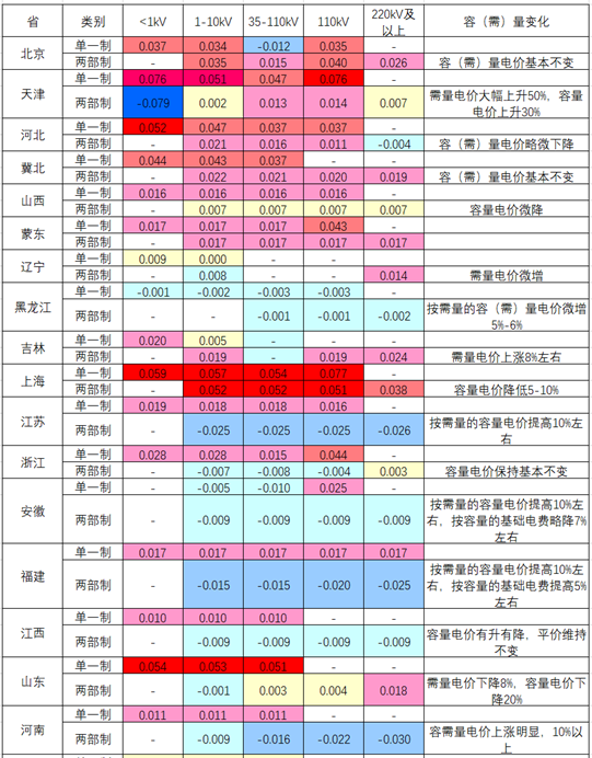 1.針對不同用戶的電價結(jié)構(gòu)更加合理。一是除個別省份對經(jīng)營性用戶仍劃分一般工商業(yè)、大工業(yè)外,其他省級單位均按照《通知》要求,僅按照用戶用電容量劃分單一制和兩部制,體現(xiàn)了公平性原則;二是按電壓等級不同執(zhí)行不同的容(需)量電價,一般電壓越高,容(需)量電價越低,合理匹配了不同電壓等級容(需)量成本差異,有利于對增量配電網(wǎng)、大用戶等高電壓等級用戶的減負。