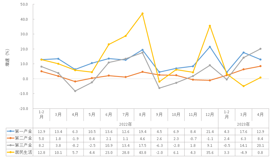 從服務(wù)業(yè)用電量來看,1~4月,生產(chǎn)性、生活性服務(wù)業(yè)用電量分別為1214億、2139億千瓦時,同比分別增長10.2%、6.8%,較2022年同期分別上升10.5、1.7個百分點,環(huán)比2022年四季度分別上升5.0、7.2個百分點。疫情防控政策優(yōu)化調(diào)整將進一步釋放服務(wù)業(yè)發(fā)展?jié)摿?;相較于工業(yè),服務(wù)業(yè)對氣溫的敏感度更高,根據(jù)國家氣候中心的預(yù)測結(jié)果,今夏氣溫將較常年偏高,將增加服務(wù)業(yè)的降溫用電需求。在經(jīng)濟持續(xù)向好、降溫需求增加的雙重拉動下,服務(wù)業(yè)用電增勢有望進一步走強。