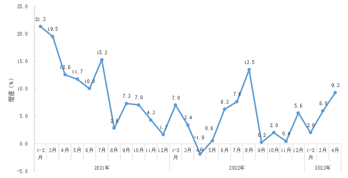 吳姍姍:從工業(yè)用電量來看,今年1~4月,工業(yè)用電量14311億千瓦時,同比增長5.1%,較2022年同期上升2.7個百分點,環(huán)比2022年四季度上升5.0個百分點;制造業(yè)用電量10488億千瓦時,同比增長4.4%,較2022年同期上升2.5個百分點,環(huán)比2022年四季度上升2.2個百分點;裝備制造業(yè)用電量同比增長7.4%,高于同期工業(yè)用電量2.3個百分點;四大高耗能行業(yè)用電量同比增長3.5%,較2022年同期上升1.9個百分點;消費品制造業(yè)用電量同比增長2.5%,較2022年同期上升1.2個百分點。考慮到黨和國家高度重視先進制造業(yè)的發(fā)展,預(yù)計今年裝備制造業(yè)仍將引領(lǐng)工業(yè)電量較快增長。