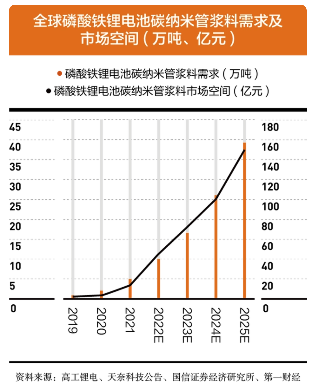 伴隨磷酸鐵鋰電池裝機(jī)占比提升,碳納米管出貨量有望快速增長(zhǎng)。高工鋰電數(shù)據(jù)顯示,2021年全球磷酸鐵鋰電池碳納米管漿料需求量為5萬(wàn)噸,市場(chǎng)規(guī)模達(dá)到18億元,預(yù)計(jì)到2025年需求量將達(dá)到39萬(wàn)噸,市場(chǎng)規(guī)模達(dá)到150億元。