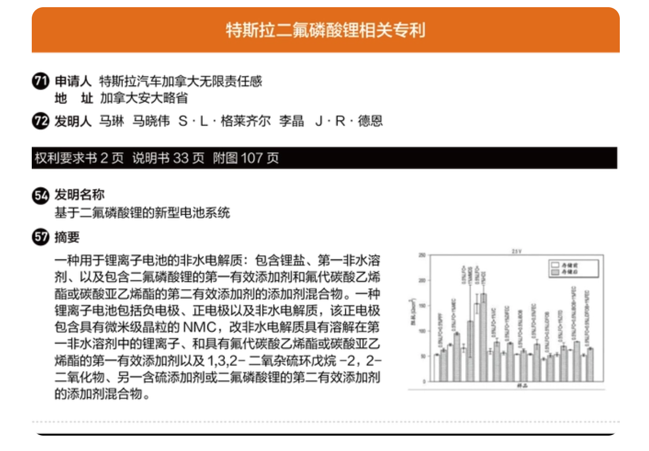 2021年9月,特斯拉申請(qǐng)了“用于儲(chǔ)能設(shè)備的二氟磷酸鹽添加劑化合物及其方法”的專(zhuān)利。特斯拉的目標(biāo)旨在改變電池單元性能,同時(shí)降低其生產(chǎn)成本。