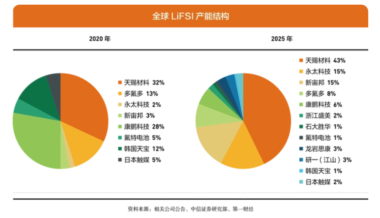 從具體企業(yè)來(lái)看,天賜材料(002709.SZ)的LiFSI產(chǎn)能2020年已占全球總產(chǎn)能的32%,2025年預(yù)計(jì)可達(dá)43%。