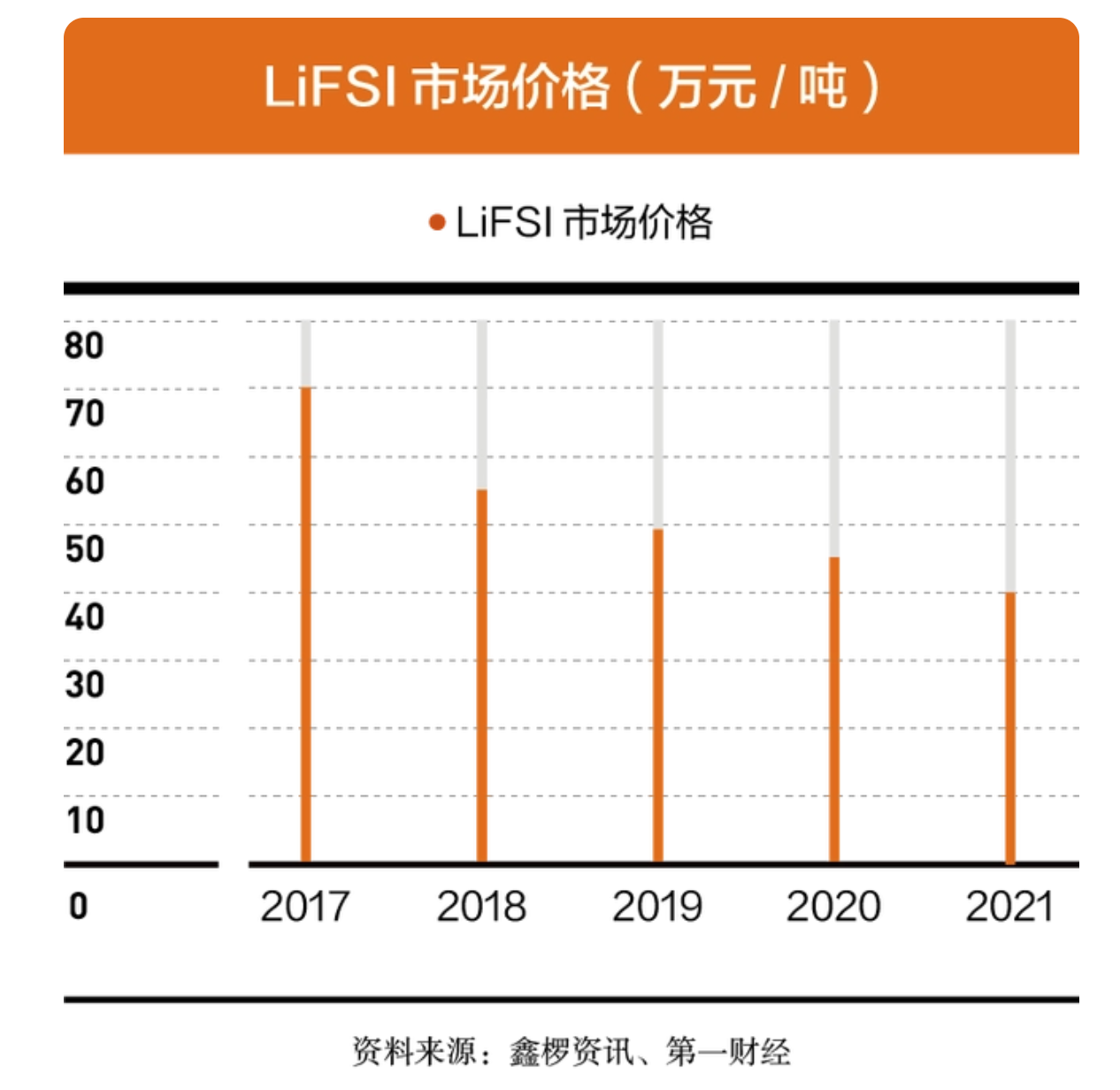 LiFSI的價(jià)格也證明了成本確實(shí)在逐步優(yōu)化。2017-2021年,LiFSI的單噸價(jià)格分別為70萬(wàn)、55萬(wàn)、49萬(wàn)、45萬(wàn)、40萬(wàn)元,而六氟磷酸鋰的價(jià)格在2021年最高漲至56.5萬(wàn)元噸,一度超過(guò)了LiFSI。