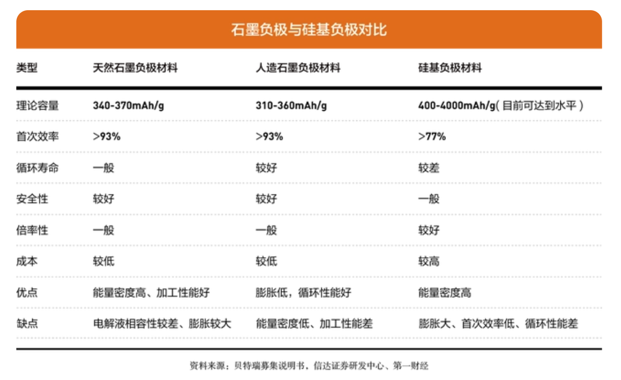 由于市場(chǎng)主流石墨負(fù)極在實(shí)際應(yīng)用中,石墨比容量達(dá)到了約330—370mAh/g,已觸及理論比容量372mAh/g的天花板;但硅的比容量超石墨10倍,能達(dá)4200mAh/g。