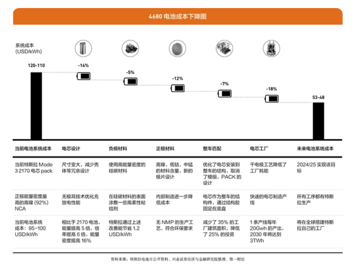 因此,CTC技術(shù)還可進(jìn)一步降低制造成本。馬斯克曾表示,CTC技術(shù)配合一體化壓鑄技術(shù)使用,可節(jié)省370個(gè)零部件、車(chē)身減重10%、每千瓦時(shí)電池成本下降7%。此外,CTC技術(shù)并非局限于4680大圓柱電芯,2170電芯同樣適用,未來(lái)或?qū)⒓嫒萜渌叽珉娦尽?