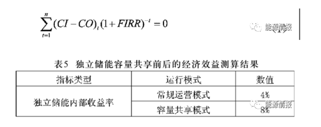 通過計(jì)算獨(dú)立儲(chǔ)能在常規(guī)運(yùn)營(yíng)和容量共享兩種模式下的內(nèi)部收益率評(píng)價(jià)其經(jīng)濟(jì)性,計(jì)算公式如式(1)所示,計(jì)算結(jié)果如表5所示。
