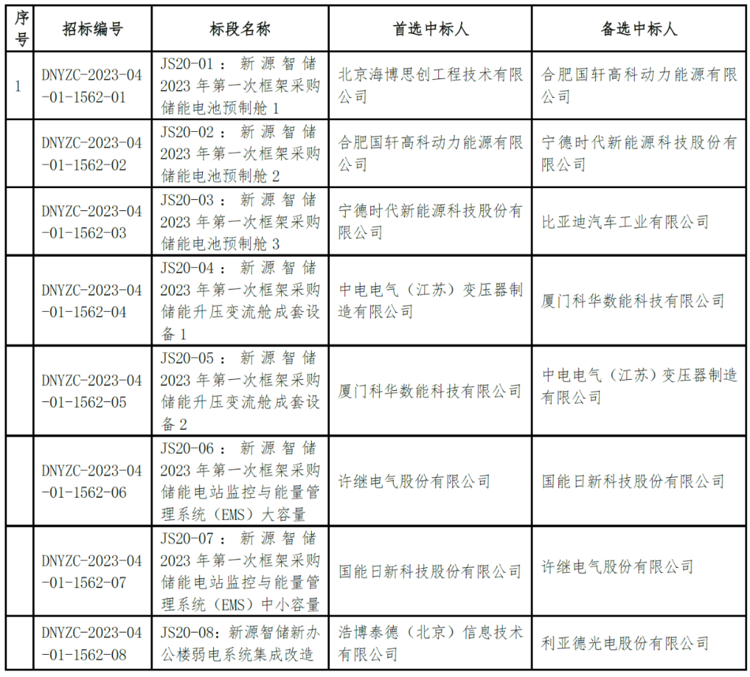 海博思創(chuàng)、國軒高科、寧德時代瓜分三個標(biāo)段儲能電池預(yù)制艙采購,采購容量合計770MWh,儲備容量合計770MWh。