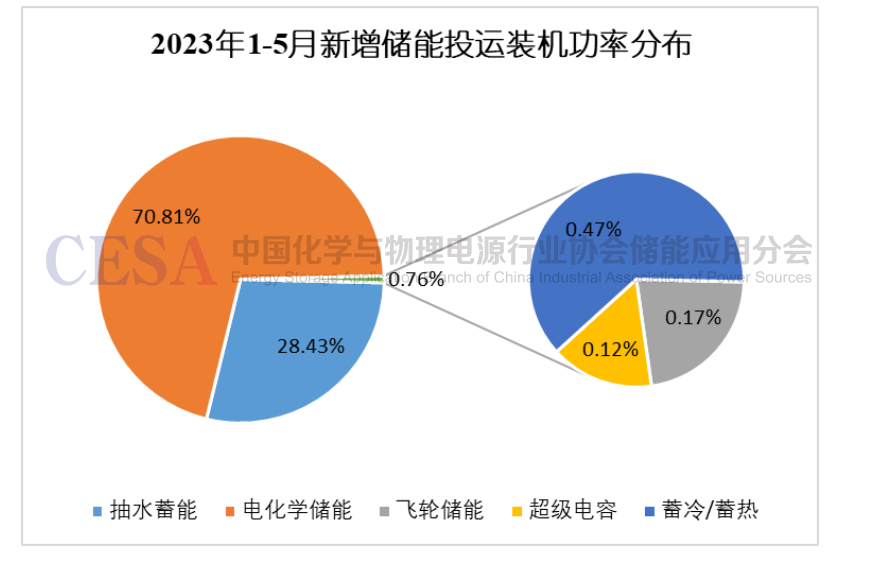 據(jù)中國(guó)化學(xué)與物理電源行業(yè)協(xié)會(huì)儲(chǔ)能應(yīng)用分會(huì)統(tǒng)計(jì),2023年1-5月共有97個(gè)新型儲(chǔ)能項(xiàng)目(3.021GW)和4個(gè)抽水蓄能項(xiàng)目(1200MW)投運(yùn),共計(jì)4.221GW。其中電化學(xué)儲(chǔ)能項(xiàng)目共91個(gè),裝機(jī)規(guī)模達(dá)3.01GW/6.41GWh;非電化學(xué)新型儲(chǔ)能項(xiàng)目共6個(gè),其中飛輪儲(chǔ)能項(xiàng)目4個(gè),裝機(jī)規(guī)模為7.2MW;超級(jí)電容項(xiàng)目1個(gè),裝機(jī)規(guī)模為5MW;熔鹽儲(chǔ)熱項(xiàng)目1個(gè),裝機(jī)規(guī)模為80MWh。