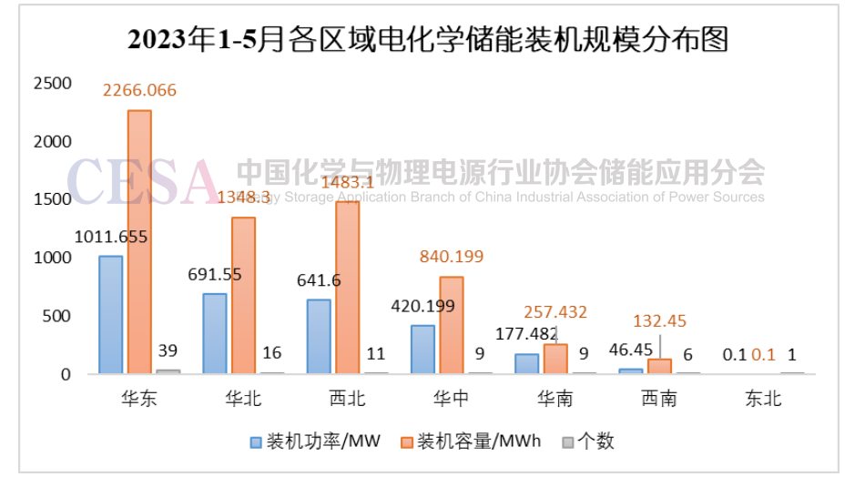 圖4 2023年1-5月各區(qū)域電化學(xué)儲(chǔ)能裝機(jī)規(guī)模分布圖