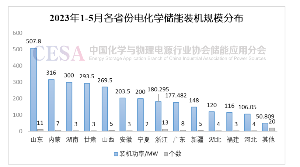 由圖5可知,2023年1-5月電化學(xué)儲(chǔ)能裝機(jī)規(guī)模Top5省份分別是山東、內(nèi)蒙、湖南、甘肅和山西。山東省5月新增一個(gè)百兆瓦級(jí)電化學(xué)儲(chǔ)能項(xiàng)目—— 華潤(rùn)電力鄄城源網(wǎng)儲(chǔ)一體化示范項(xiàng)目,該項(xiàng)目是菏澤市首座商業(yè)化運(yùn)行的集中式共享儲(chǔ)能電站,也是山東省儲(chǔ)能示范項(xiàng)目和省重點(diǎn)項(xiàng)目,其裝機(jī)容量100MW/200MWh,包括99MW/198MWh磷酸鐵鋰電池儲(chǔ)能系統(tǒng)和1MW/2MWh全釩液流電池儲(chǔ)能系統(tǒng),項(xiàng)目投運(yùn)后,能夠進(jìn)一步提升當(dāng)?shù)仉娏ο到y(tǒng)的靈活性,可有效參與電網(wǎng)調(diào)峰、調(diào)頻,促進(jìn)電力供需平衡,為提升當(dāng)?shù)仉娋W(wǎng)新能源消納能力和電網(wǎng)安全穩(wěn)定運(yùn)行貢獻(xiàn)力量,同時(shí)也為區(qū)域后續(xù)集中儲(chǔ)能項(xiàng)目的建設(shè)積累了經(jīng)驗(yàn)。截至5月底,2023年山東省共新增電化學(xué)儲(chǔ)能裝機(jī)507.8MW,多個(gè)大型網(wǎng)側(cè)、源側(cè)電化學(xué)儲(chǔ)能項(xiàng)目的并網(wǎng)投運(yùn)讓山東省儲(chǔ)能裝機(jī)規(guī)模遙遙領(lǐng)先。湖南省和山西省5月也新增百兆瓦級(jí)電網(wǎng)側(cè)儲(chǔ)能電站,成功躋身電化學(xué)儲(chǔ)能裝機(jī)Top5省份。