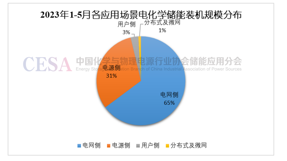 圖7 2023年1-5月各應(yīng)用場(chǎng)景電化學(xué)儲(chǔ)能裝機(jī)規(guī)模占比分布