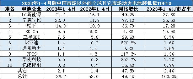 市占率方面,除中國市場以外的全球其它市場動力電池裝機量TOP10排行榜中,中國企業(yè)1-4月總體市占率為31.7%,較1-3月的30.6%提高1.1個百分點;同比2022年1-4月24.4%的市占率提高7.3個百分點。這表明,包括寧德時代在內的中國企業(yè),在除中國市場以外的全球其它市場的裝機量呈現(xiàn)明顯、持續(xù)的增長態(tài)勢。