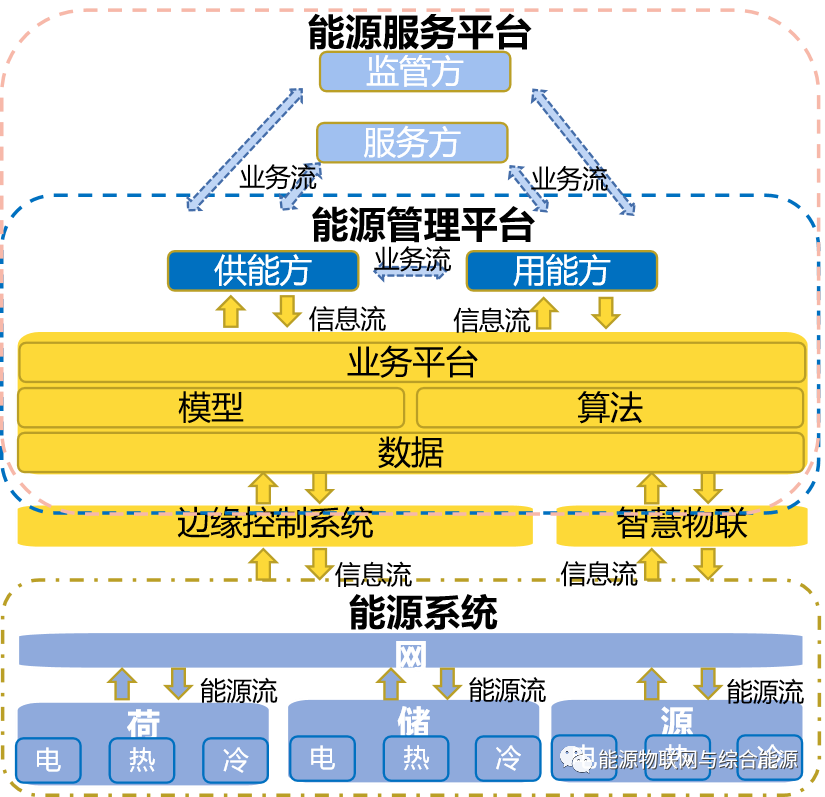其中,綜能能源系統(tǒng)是具有源網(wǎng)荷儲(chǔ)技術(shù),通常會(huì)采用新能源(如:光伏)、可再生能源(如:熱泵)、梯級(jí)利用(如:燃?xì)夥植际侥茉椿蛴酂峄厥眨┗蚨嗄芑パa(bǔ)技術(shù)改善能源結(jié)構(gòu)和提高能效利用,并通過儲(chǔ)能(電化學(xué)儲(chǔ)能或蓄冷蓄熱)和柔性負(fù)荷強(qiáng)化系統(tǒng)自平衡能力;綜合能源管理平臺(tái)為綜合能源系統(tǒng)優(yōu)化運(yùn)行和智慧運(yùn)維提供技術(shù)支撐。這二者重點(diǎn)針對單個(gè)綜合能源項(xiàng)目,確保設(shè)備設(shè)施安全、可靠、高效運(yùn)行,為用能用戶提供多種能源供應(yīng)。