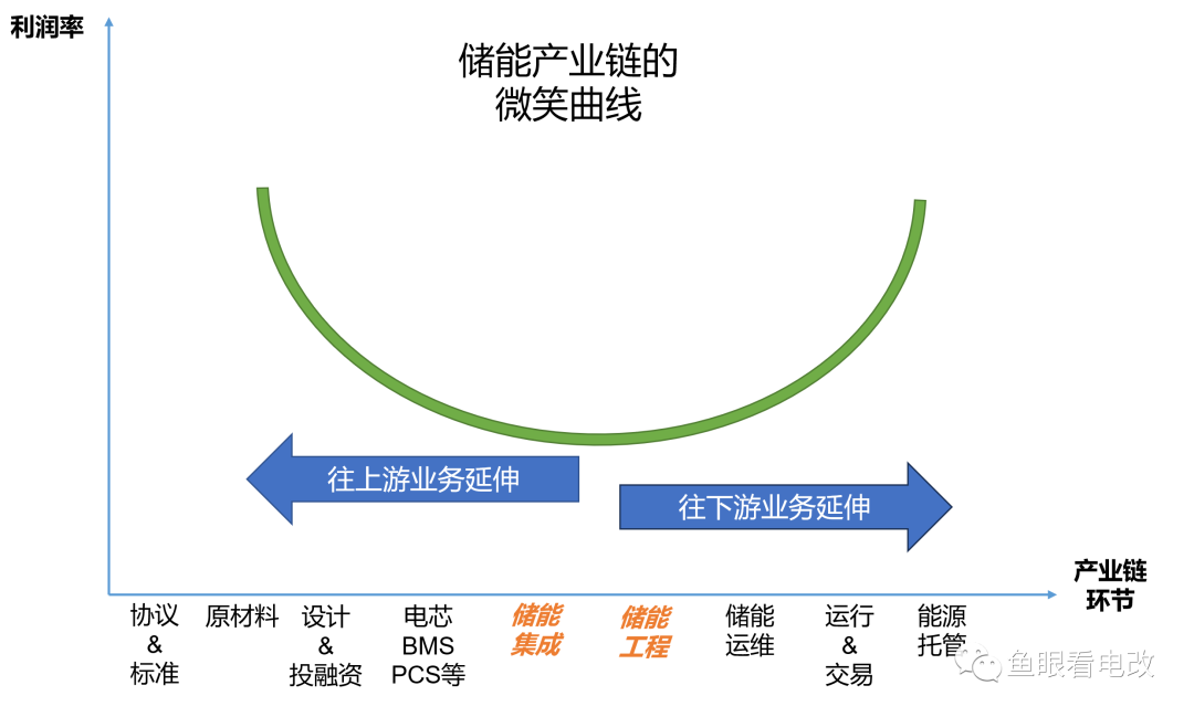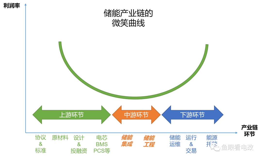 參考IT行業(yè)的“微笑曲線”模型,儲能產業(yè)鏈也呈現(xiàn)出“兩頭高、中間低”的微笑曲線。