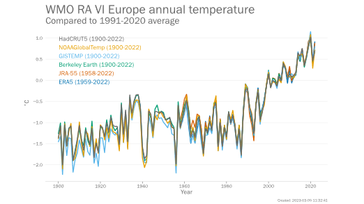歐洲2022年的年平均氣溫介于有記錄以來的第二和第四高點之間,異常值比1991-2020年的平均值高出約0.79℃。