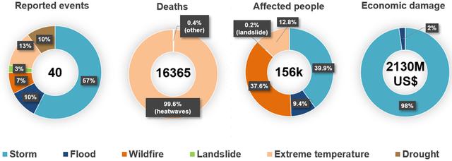 其中,大約67%的事件是與洪水和風暴有關的,占總經(jīng)濟損失的大部分,約20億美元。就死亡率而言,更嚴重的原因是熱浪,據(jù)報道,熱浪導致了16000多人的死亡。