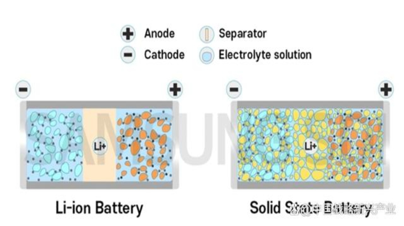 商業(yè)上使用的鋰離子電池有一個隔板,用液體電解質(zhì)溶液將陰極和陽極分開。而在固態(tài)電池中,正極、負(fù)極和固態(tài)電解質(zhì)被連續(xù)堆疊在一起,形成一個固定的單元。具有固體電解質(zhì)的固態(tài)電池顯示出更高的穩(wěn)定性和固體結(jié)構(gòu),提高了安全性。