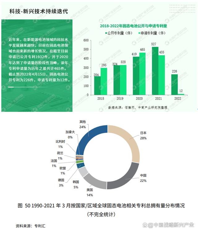 新能源電池領(lǐng)域的科技水平發(fā)展越來越快,目前在固態(tài)電池領(lǐng)域也迎來新的增長情況,申請已公開專利1932件,并于2020年達(dá)到了申請量的階段性頂峰,該年專利申請量為歷年之最共計(jì)465件。截止2022年4月15日,固態(tài)電池公開專利為226件,申請專利量為12件。