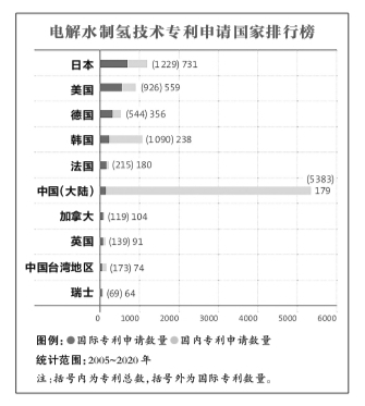 電解水制氫相關(guān)專利數(shù)量增長(zhǎng)主要來(lái)自中國(guó),中國(guó)申請(qǐng)人主要關(guān)注國(guó)內(nèi)市場(chǎng),中國(guó)申請(qǐng)的相關(guān)專利中僅3%為國(guó)際專利。從專利申請(qǐng)總數(shù)來(lái)看,排在中國(guó)之后的依次是日本、韓國(guó)、美國(guó)、德國(guó)和法國(guó)。歐盟此前推出了氫能發(fā)展戰(zhàn)略,將綠氫作為發(fā)展的重點(diǎn),歐洲國(guó)家專利申請(qǐng)數(shù)量也居于前列。