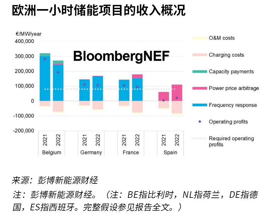 2022年,超過80%的收入來自英國、愛爾蘭、德國、法國、比利時(shí)和荷蘭的頻率響應(yīng)。頻率主導(dǎo)的商業(yè)案例的利潤極其豐厚,比利時(shí)一小時(shí)電池儲(chǔ)能的年收入高達(dá)20萬歐元/MW。