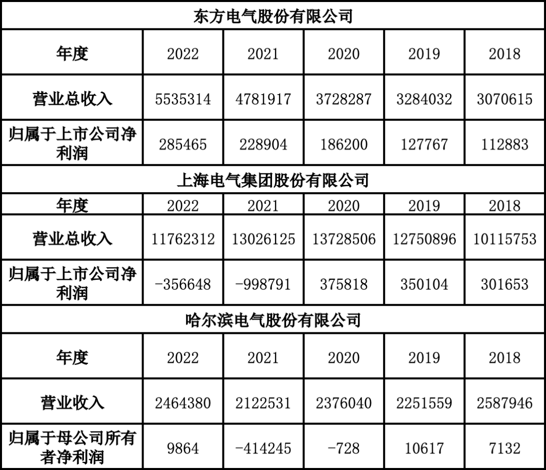 上海電氣集團(tuán)、哈爾濱電氣集團(tuán)、東方電氣集團(tuán)是國(guó)內(nèi)三大電力裝備企業(yè)。從上市公司業(yè)績(jī)來看,三家企業(yè)均面臨不同程度的經(jīng)營(yíng)壓力。與上海電氣集團(tuán)股份有限公司類似,哈爾濱電氣股份有限公司2020—2021年連續(xù)兩年虧損,2022年剛剛扭虧。