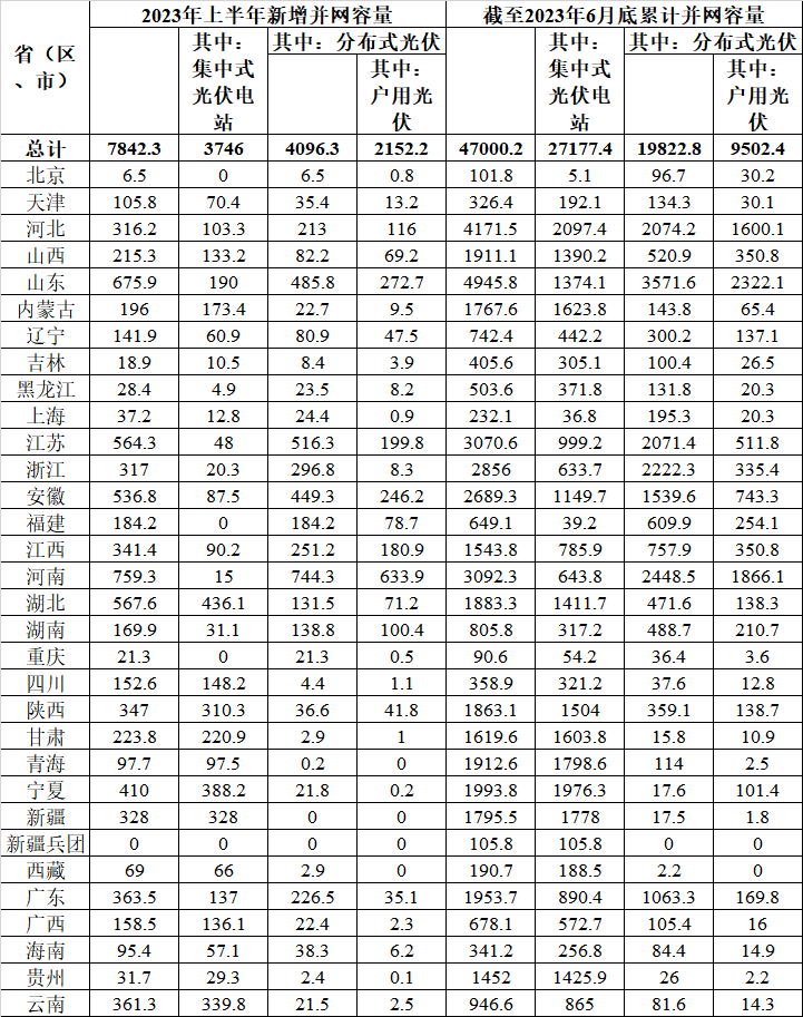 3.2023年上半年部分?。ㄗ灾螀^(qū)、直轄市)裝機(jī)有退運(yùn)減容,截至2022年底累計(jì)并網(wǎng)容量按當(dāng)年凈增并網(wǎng)容量統(tǒng)計(jì)。