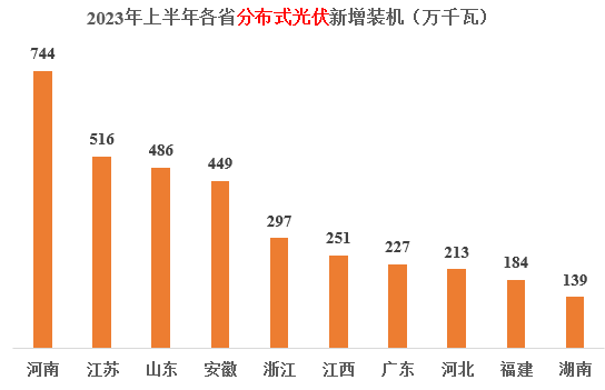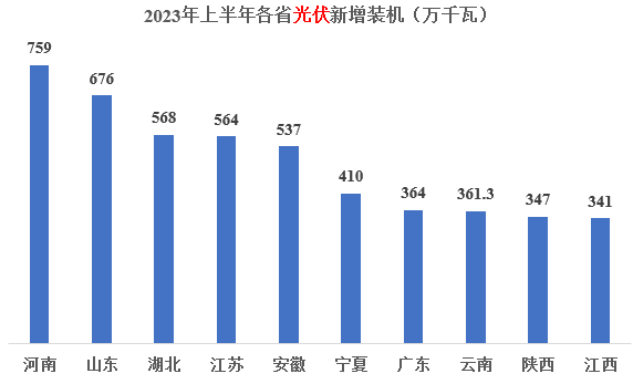 2023年上半年戶(hù)用裝機(jī)規(guī)模為2152萬(wàn)千瓦,前三的省份分別為:河南、山東、河北;前十省份合計(jì)1969萬(wàn)千瓦,占到全國(guó)新增光伏裝機(jī)的91%。新增光伏總裝機(jī)前十省份的具體情況如下圖所示。