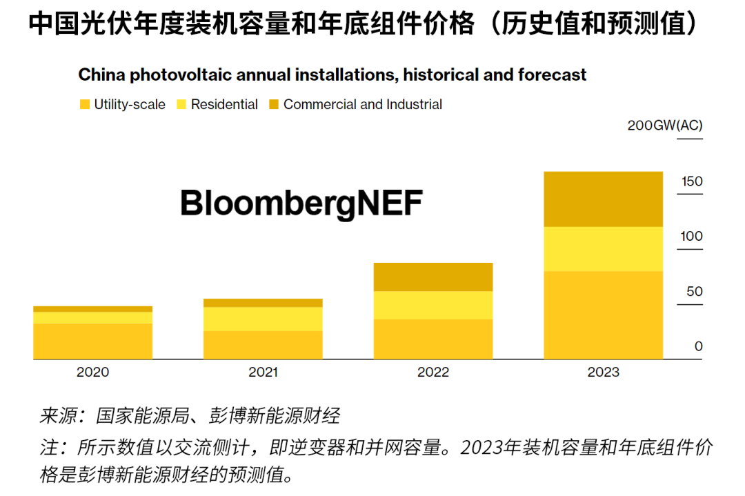 彭博新能源財(cái)經(jīng)對(duì)中國(guó)2023年光伏裝機(jī)容量的預(yù)測(cè)