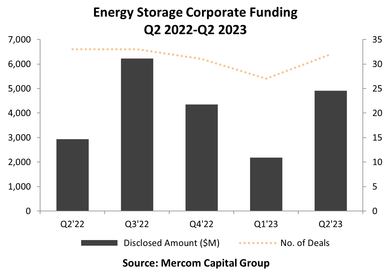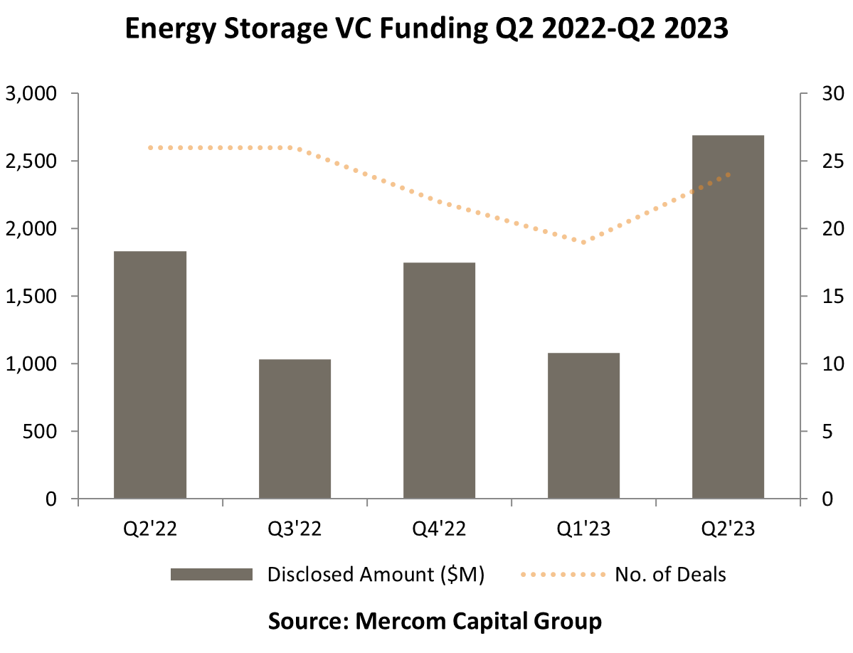 儲能公司的風險投資(VC)資金增長強勁,2023年上半年達成43筆交易籌集了38億美元,而2022年上半年達成48筆交易籌集了30億美元,因此同比增長27%。