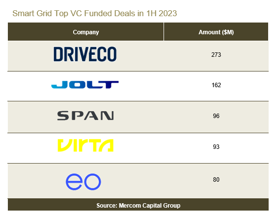 在2023年上半年,也有幾筆值得注意的智能電網(wǎng)風險投資(VC)融資交易。排名前五的交易包括Driveco公司獲得了令人印象深刻的2.73億美元,Jolt Energy公司獲得1.62億美元,SPAN公司獲得9600萬美元;Virta公司獲得9300萬美元,以及EOCharging公司獲得8000萬美元。