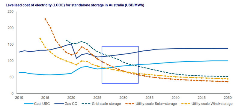 目前,與其他可調(diào)度發(fā)電設(shè)施相比,獨(dú)立部署的電網(wǎng)規(guī)模儲(chǔ)能系統(tǒng)的度電成本(LCOE)仍然高昂,但根據(jù)Wood Mackenzie公司的調(diào)查,到2032年,儲(chǔ)能系統(tǒng)的成本大幅降低將削弱天然氣發(fā)電的競(jìng)爭(zhēng)力。