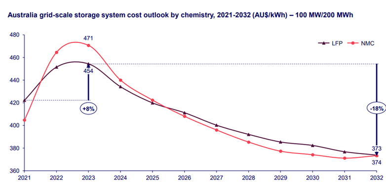 由于在澳大利亞部署的儲(chǔ)能項(xiàng)目主要針對(duì)高價(jià)值的頻率控制和輔助服務(wù)(FCAS)市場(chǎng),持續(xù)時(shí)間為兩小時(shí)的電網(wǎng)規(guī)模電池儲(chǔ)能系統(tǒng)目前是主流的儲(chǔ)能技術(shù)。到2032年,預(yù)計(jì)磷酸鐵鋰電池(LFP)和NMC三元鋰離子電池價(jià)格將下降40%以上。這反過(guò)來(lái)將推動(dòng)電池儲(chǔ)能系統(tǒng)成本在未來(lái)十年內(nèi)下降18%至21%,這成為削減資本支出的最大動(dòng)力。
