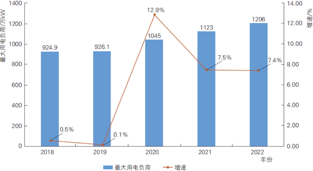 2018-2022年青海電網(wǎng)最大負(fù)荷及增速變化