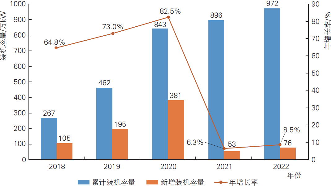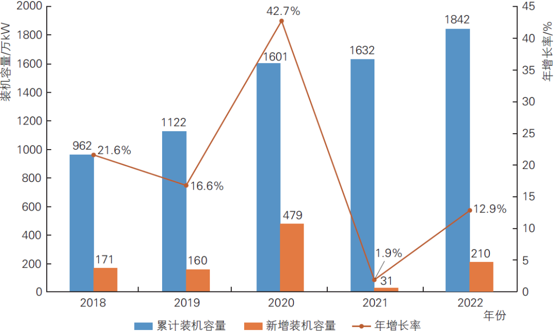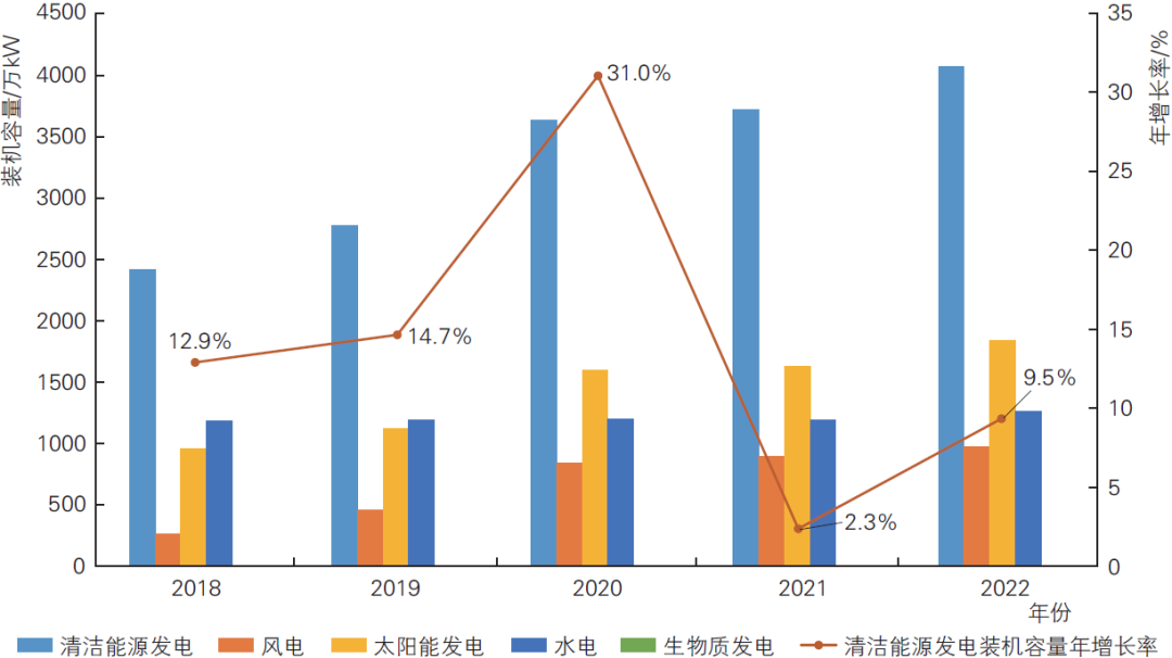 2018-2022年清潔能源裝機(jī)容量及年增長(zhǎng)率變化對(duì)比