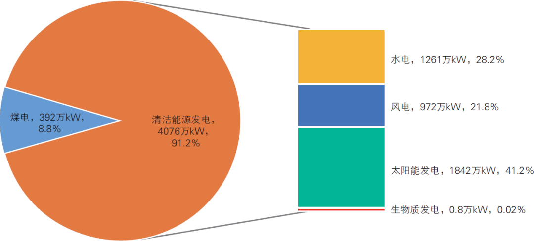 青海省清潔能源裝機(jī)規(guī)模突破4000萬(wàn)千瓦,占比突破91%。截至2022年底,青海省各類電源總裝機(jī)容量4468萬(wàn)千瓦,同比增長(zhǎng)8.6%。煤電裝機(jī)容量392萬(wàn)千瓦,占全部電力裝機(jī)容量的8.8%;清潔能源發(fā)電裝機(jī)容量達(dá)4076萬(wàn)千瓦,占比達(dá)91.2%。其中,水電裝機(jī)容量1261萬(wàn)千瓦,占比28.2%;風(fēng)電裝機(jī)容量972萬(wàn)千瓦,占比21.8%;太陽(yáng)能發(fā)電裝機(jī)容量1842萬(wàn)千瓦,占比41.2%,生物質(zhì)發(fā)電裝機(jī)容量0.8萬(wàn)千瓦,占比0.02%。
