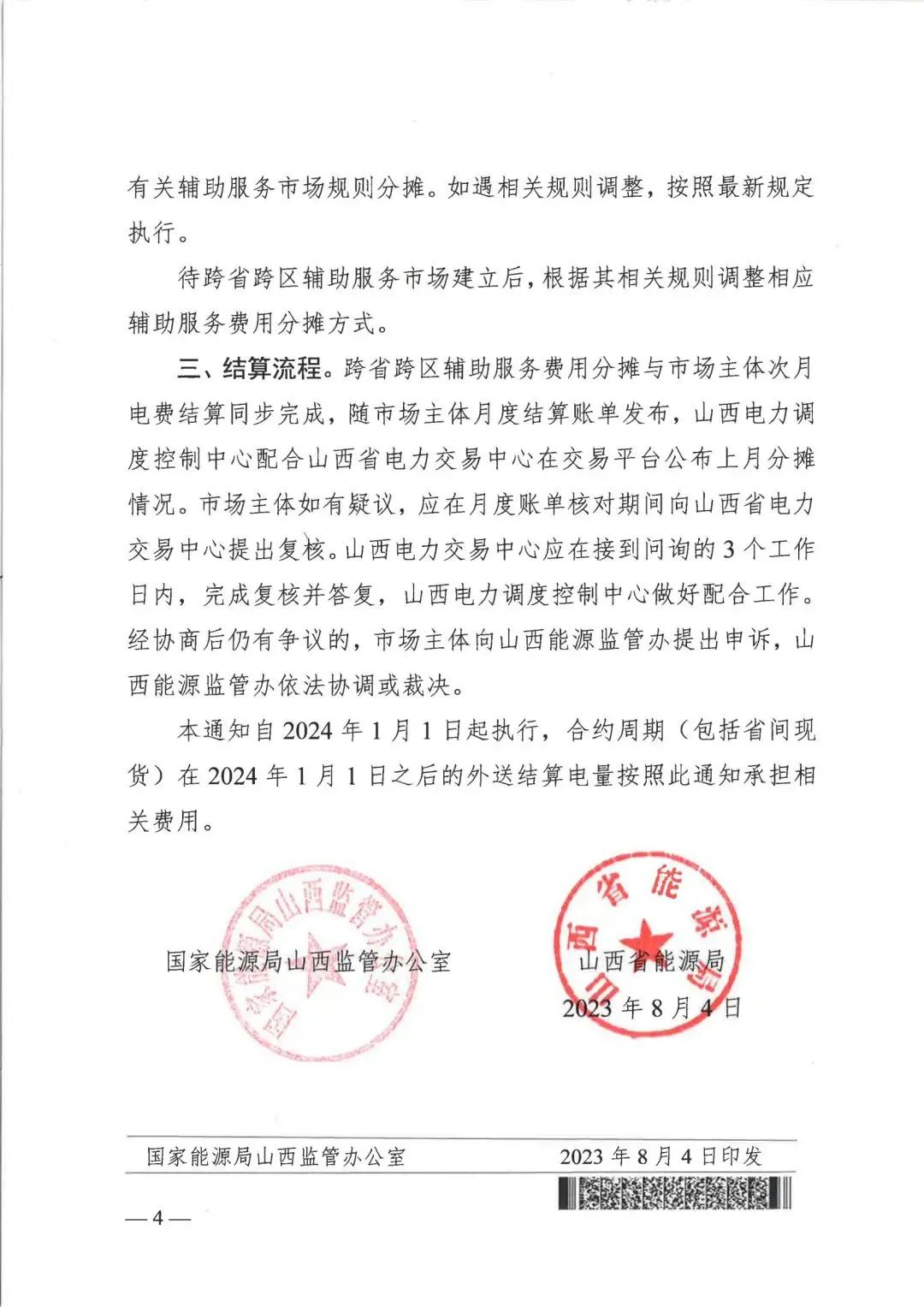 四是明確了執(zhí)行時(shí)間??紤]到山西省跨省跨區(qū)年度、多月中長期交易已完成,且本年度送京津唐政府間協(xié)議外送電量、電價(jià)均已確定,未包含受端省份應(yīng)承擔(dān)的輔助服務(wù)費(fèi)用,2023年內(nèi)執(zhí)行的話涉及到事后調(diào)整外送電量價(jià)值,對已成交外送電量的主體來說有失公平。為切實(shí)保障市場主體合理利益,通知明確合約周期(包括省間現(xiàn)貨)在2024年1月1日之后的外送結(jié)算電量按照此通知承擔(dān)相關(guān)費(fèi)用。