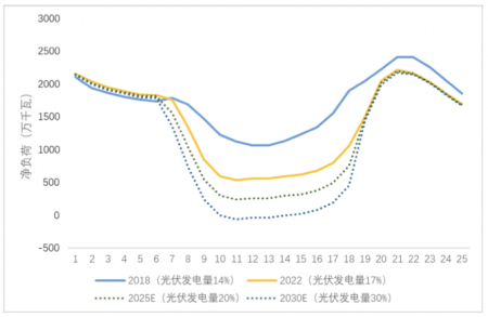 根據(jù)招商證券2022年的一份報(bào)告,如果不附加儲(chǔ)能,電網(wǎng)的風(fēng)光消納閾值在15%上下。如果風(fēng)光滲透率由20%向上提升,將會(huì)造成系統(tǒng)凈負(fù)荷的波動(dòng)幅度、劇烈程度陡增。
