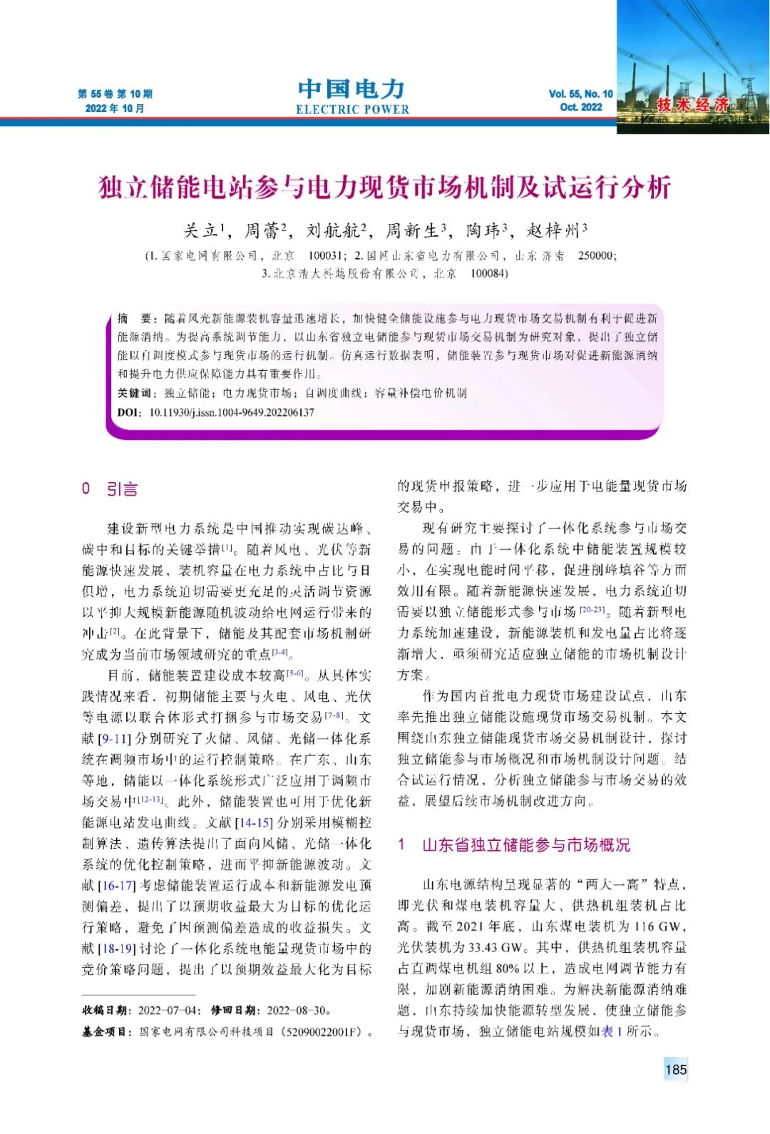 關(guān)立, 周蕾, 劉航航, 等. 獨(dú)立儲能電站參與電力現(xiàn)貨市場機(jī)制及試運(yùn)行分析[J]. 中國電力, 2022, 55(10): 185-190.