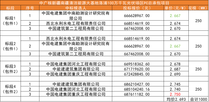 根據(jù)中標(biāo)公告,中標(biāo)價(jià)格在2.667元/W~2.75元/W之間,均價(jià)在2.693元/W;中標(biāo)候選人有中國(guó)電建集團(tuán)中南勘測(cè)設(shè)計(jì)研究院有限公司、西北水利水電工程有限責(zé)任公司、中國(guó)建筑第二工程局有限公司、中國(guó)電建集團(tuán)河北工程有限公司、中能建建筑集團(tuán)有限公司以及中國(guó)電建集團(tuán)重慶工程有限公司。各標(biāo)段中標(biāo)情況如下:
