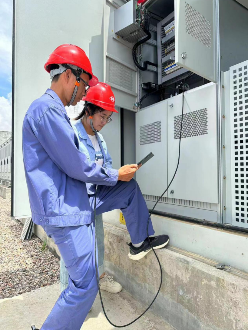 就是在這樣的桑拿天里,為了早日完成驗(yàn)收并網(wǎng),在寧夏寧東200MW/400MWH共享儲(chǔ)能項(xiàng)目現(xiàn)場,平高儲(chǔ)能科技公司的調(diào)試工程師朱超峰、程寧及項(xiàng)目經(jīng)理?xiàng)钣颀?,冒著高溫酷暑和?qiáng)烈的紫外線,在滿目戈壁的項(xiàng)目現(xiàn)場,開展緊張而繁重的調(diào)試工作。