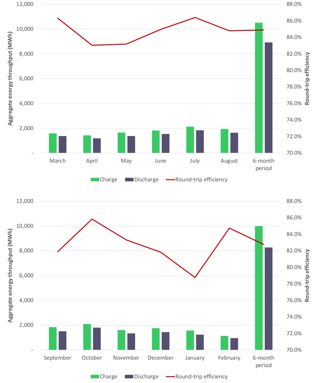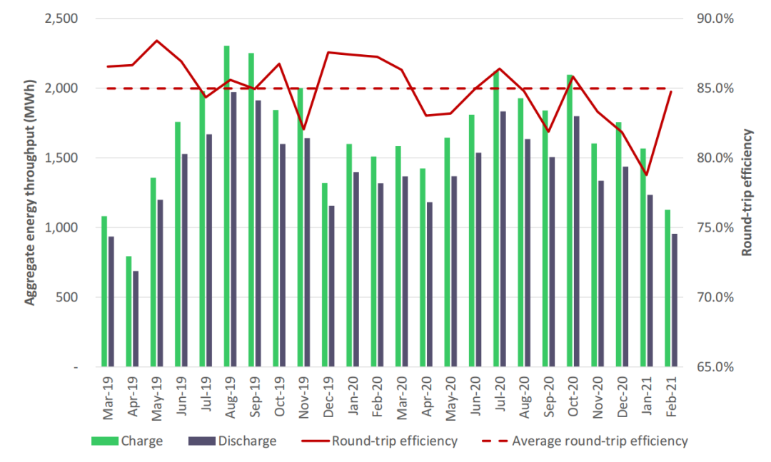 如圖 8 所示,截至 2020 年 8 月的 6 個月期間,GESS 的平均往返效率為 84.9%,截至 2021 年 2 月的 6 個月期間,平均往返效率為 82.8%,在約 79-86% 之間波動。請注意,此往返效率計算是在設(shè)施收益表上根據(jù)觀察到的市場購買和出售的總能源(即總排放/總充電)進行的。因此,它包含系統(tǒng)損失余額,并且未針對 MLF 進行調(diào)整。這是一種與正式性能測試不同且更近似的計算,正式性能測試將規(guī)定標(biāo)準(zhǔn)測試條件,包括充電和放電的額定功率以及充電和放電之間的定義時間段。
