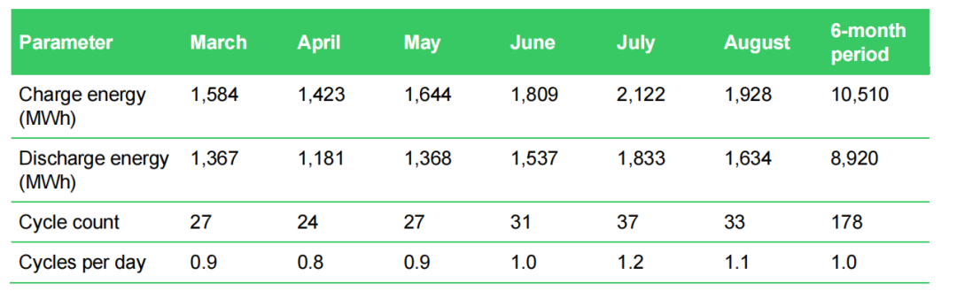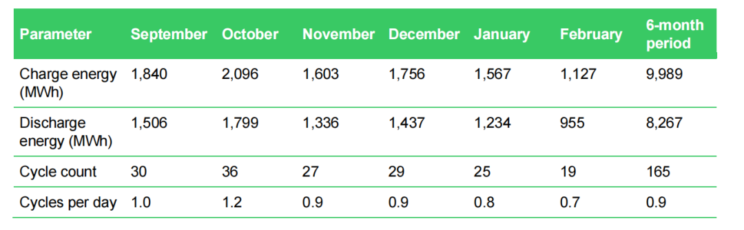 自 3 月初以來,GESS 平均每天運行一個循環(huán),截至 2020 年 8 月的 6 個月內(nèi),總充電能量為 10,510 MWh,放電能量為 8,920 MWh,6 個月內(nèi)分別為 9,989 MWh 和 8,267 MWh。截至 2021 年 2 月的一個月。與前一年類似,進入夏季的肩季觀察到了最大的循環(huán)行為。表 7 總結(jié)了截至 2020 年 8 月的 6 個月期間的充電和放電循環(huán)結(jié)果,表 8 總結(jié)了截至 2021 年 2 月的 6 個月期間。